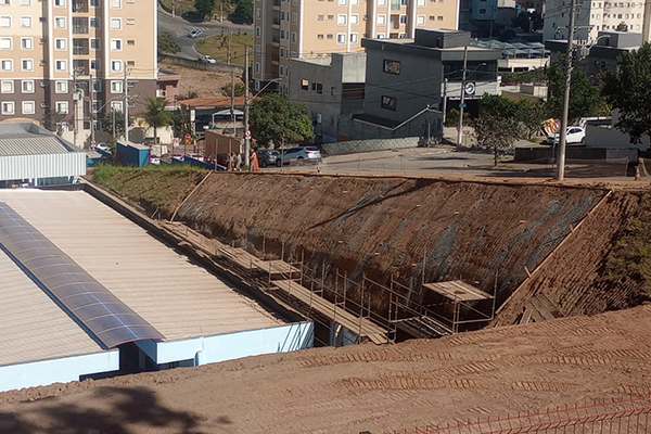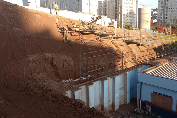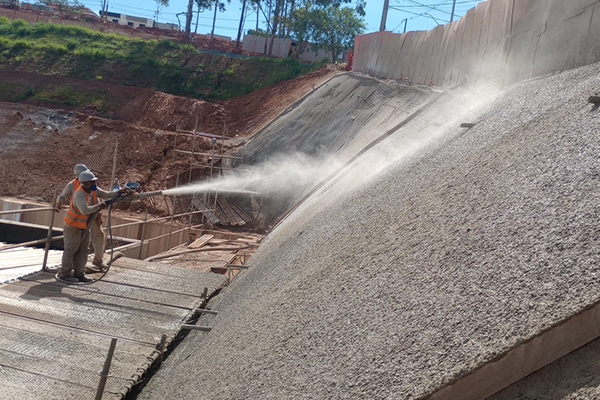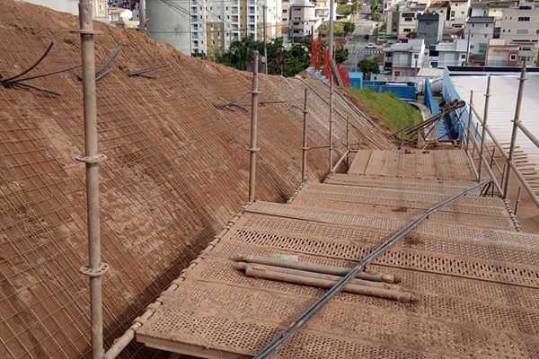 Elaboração de projeto executivo, fornecimento de materiais e execução de obras de contenção em Solo Grampeado com apoio de máquinas de terraplanagem, bem como execução de concreto projetado fck 30Mpa, totalizando 374,00 m², 1.719,00 m de perfuração em solo e 52.000 kg de injeção de calda de cimento.