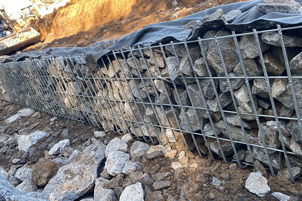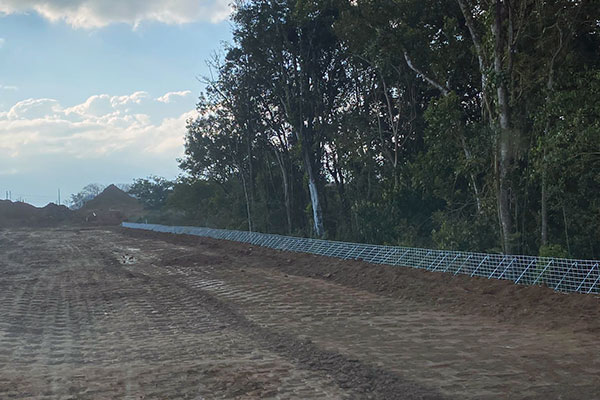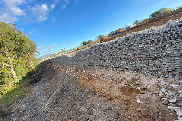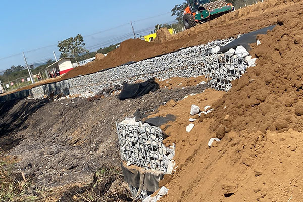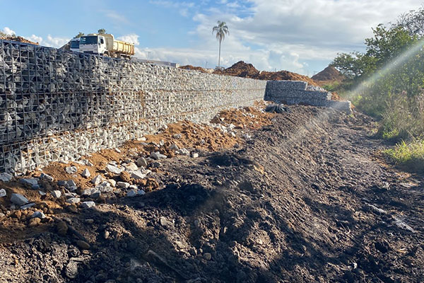 Execução de contenção de solo reforçado com geogrelhas resistências variadas e face em tela metálica em “L”, sistema denominado Strata Slope, total de 560 m², altura máxima de 4,50 m e comprimento máximo de 99,60 m.