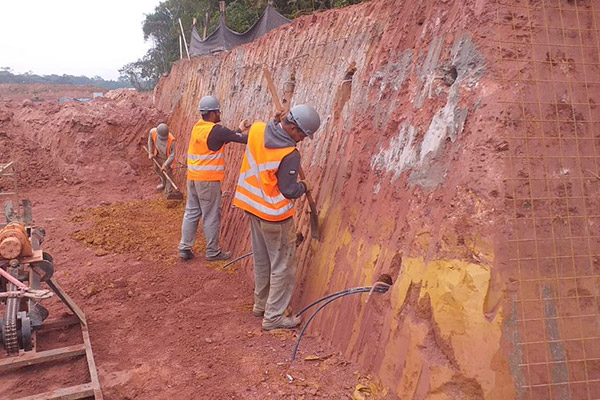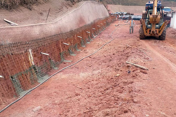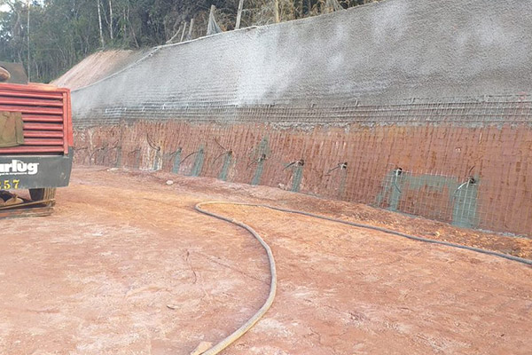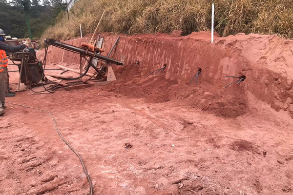 Execução de contenção em corte tipo solo grampeado totalizando 782,61 m² de área de face, 3.810m de perfuração em solo, 92.520kg de injeção de calda de cimento e 73,60 m³ de concreto projetado resistência de 30Mpa