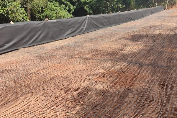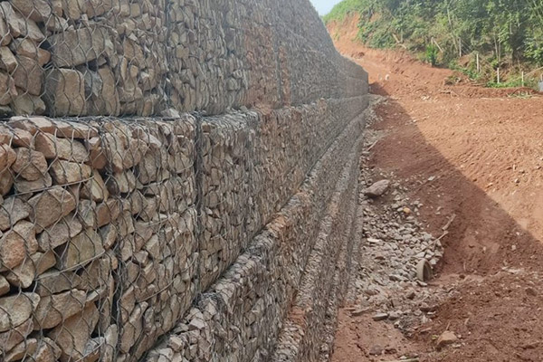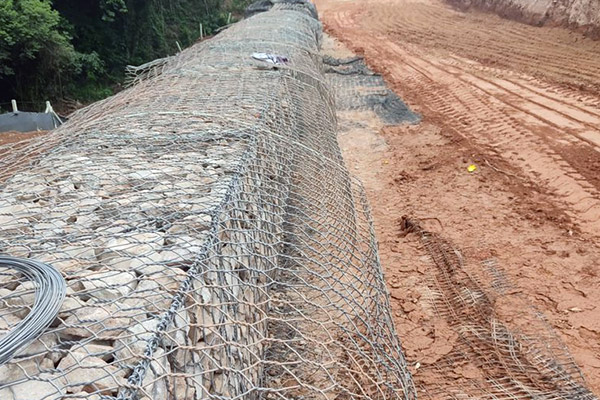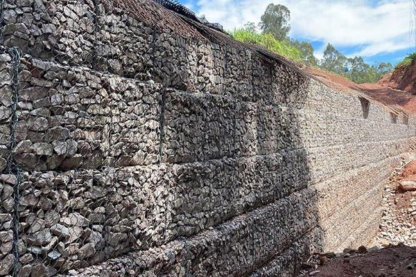 Execução de muro de contenção em aterro com solo reforçado com geogrelha de resistência variada, denominado Terramesh com área de face de 228,00 m²